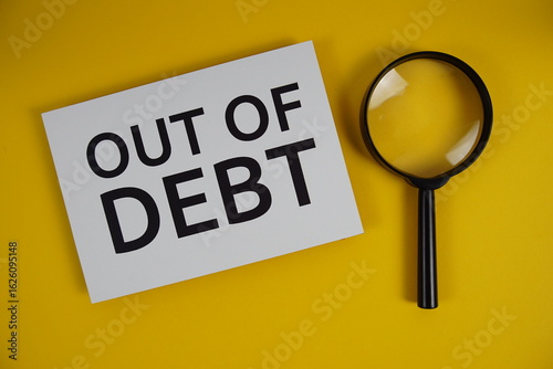 Out of Debt letters with magnifying glass flat lay on yellow background