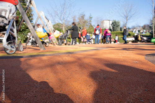 out of focus families and kids playing in public park in quarantine days in freedom park in Kadikoy, Istanbul, Turkey low angle view with copy space