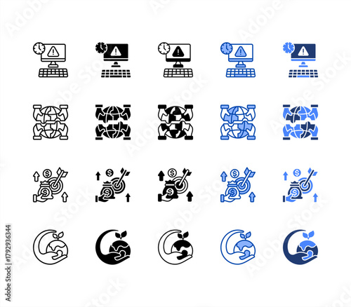 Outdated, Political instability, Limited funds, Environmental issues multiple style icon set.