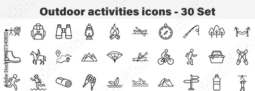 Outdoor Activities and Recreation Adventure Icons. Line Art 30 Set Icon Collection Vector Illustration