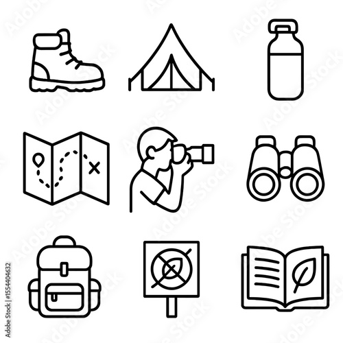 Outdoor Activity Icons. Outline icon set of low-impact outdoor activities: hiking boots, camping tent, reusable water bottle,