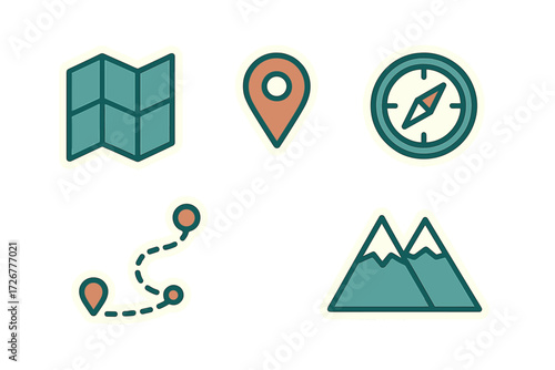 Outdoor adventure and travel navigation elements featuring map, location pin, compass, route, and mountains