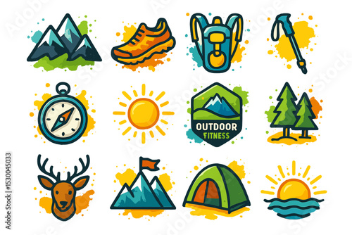 Outdoor adventure icons set: mountains, hiking, camping, nature, exploration