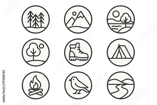 Outdoor adventure linear icon set. featuring forest, mountain, river, tree, boot, tent, campfire, bird, landscape symbols