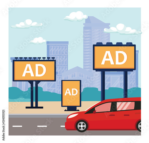 Outdoor advertising design concept. Urban Roadside Advertising with Billboards and Car.