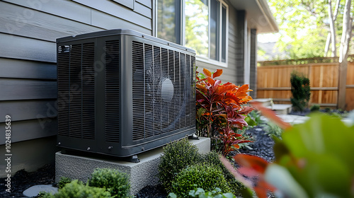 Outdoor air conditioning unit beside vibrant plants and landscaping.