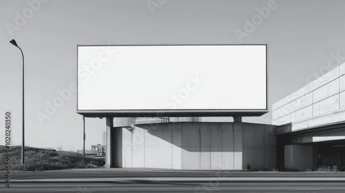 Outdoor billboard with a clean white screen, featuring minimalist architecture and ample copy space.