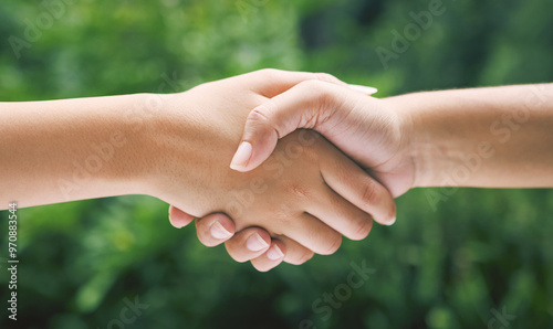 Outdoor, closeup and people with handshake for greeting, support and motivation with solidarity trust. Nature, friends and partnership with shaking hands for agreement, connection and success by zoom