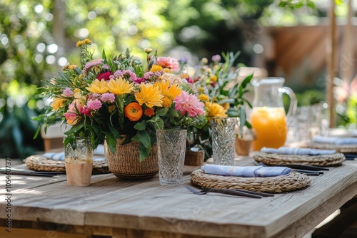 outdoor entertaining, wooden table in a cozy backyard with brazilian lemonade pitcher and vibrant summer florals, set for guests