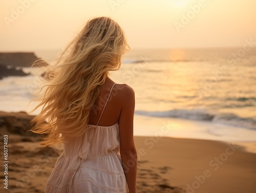 Outdoor fashion portrait of beautiful sensual lady wearing stylish maxi chiffon dress posing at sunset in the beach, have long blonde hairs bright make up and accessorizes
