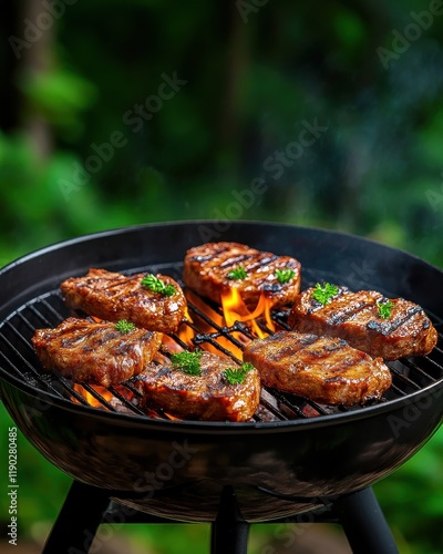 [Outdoor grilling meat techniques backyard] BBQ Outdoor Feast Grilled Pork Ribs & Steaks with Char Marks, Camping Picnic Table & Woodland Setting.