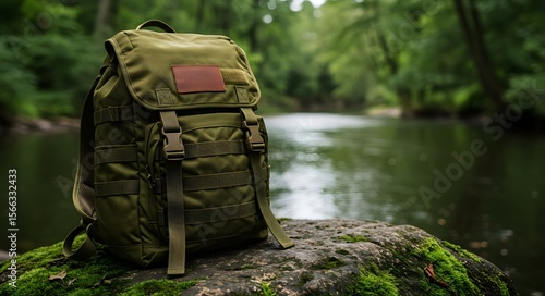 Outdoor Hiking Backpack on Mossy Rock by River, Rugged Olive Green Rucksack for Adventure and Travel, Camping and trekking equipment