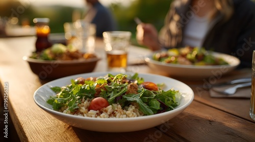 Outdoor meal with salads and grains on a wooden table at sunset illuminated by golden hour light