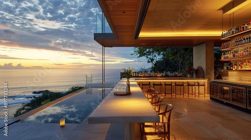 Outdoor open floor bar with an ocean view.