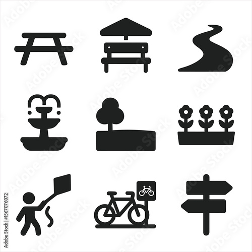 Outdoor Park Icon Set. Solid, filled icons set of outdoor park activities: picnic table, shaded bench, walking