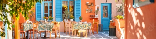 Outdoor patio dining at a vibrant, sun-drenched Mediterranean restaurant.