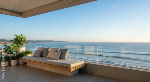 Outdoor patio with a modern daybed assorted potted greenery and a sweeping view of the calm ocean and distant shore under a clear blue sky