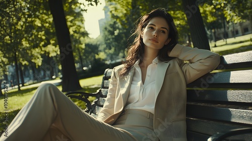 Outdoor portrait of beautiful woman resting in park, sitting on bench, wearing beige suit.