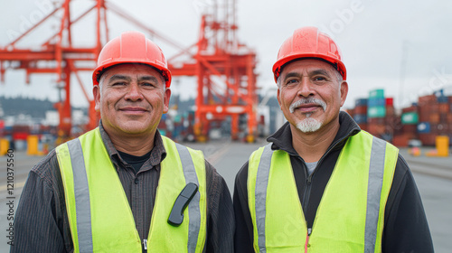 Outdoor portrait of construction workers smiles and team spirit at port