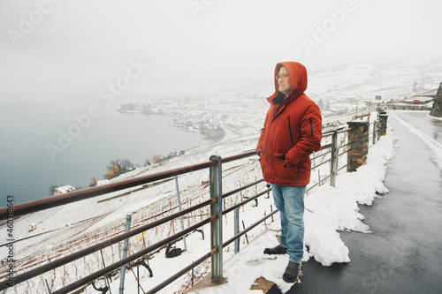Outdoor portrait of middle age man enjoying winter landscape of snowy vinyards