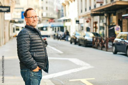 Outdoor portrait of middle age man in city, wearing blue jacket and eyeglasses