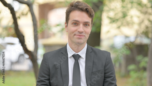 Outdoor Portrait of Satisfied Businessman Shaking Head in Acceptance
