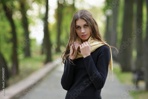 Outdoor portrait of young beautiful brunette woman with wavy long hair stares into camera posing on the park path