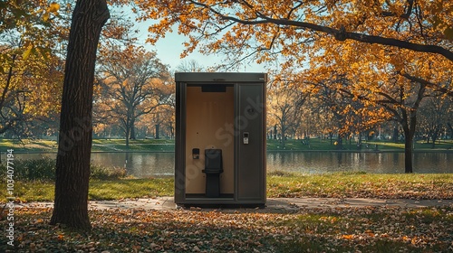 Outdoor public toilet in a peaceful autumn park surrounded by trees