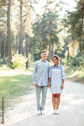 Outdoor shot of young happy couple in love on sunny day on nature. Man and woman hugging, sunlight in summer park. valentine's day. The concept holiday.