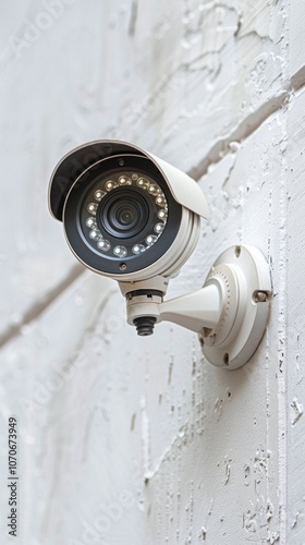 Outdoor surveillance camera on white brick wall. Circular, white with black border, small unlit lights around lens, black strap. Chipped paint on wall.