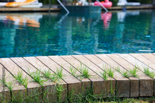 Outdoor swimming pool with wooden deck at resort