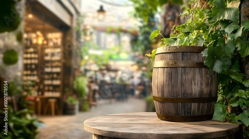 Outdoor Wine Presentation: Barrel on Table with Greenery and Store View