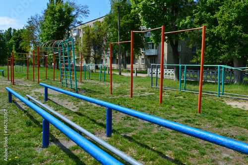 Outdoor workout playground with metal bars and climbing frames, old urban sports ground, sunny day, green grass, residential area.
