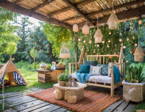 Outdoor-themed nursery with nature-inspired decor and soft furnishings for a calming space
