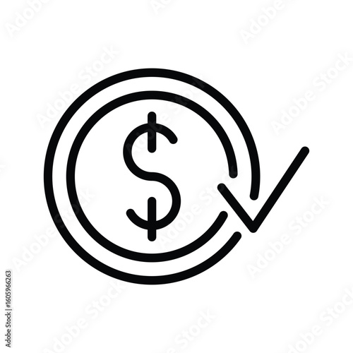 Outline art of a coin featuring a dollar sign with an encircling arrow pointing downwards and transforming into a checkmark