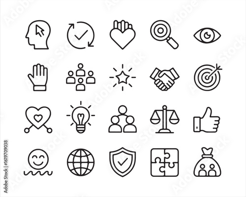 Outline Business Values Icon Set – Ethics, Teamwork, Vision, Leadership Symbols