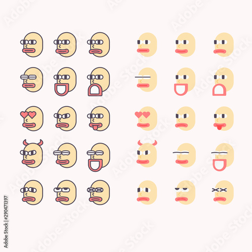 Outline color and flat vector graphic emoticon set. Face icon with various facial expression.