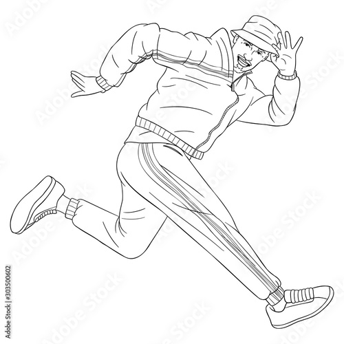 outline drawing of a boy jumping in the air and holding his hat by hand. laughing, jumping, tracksuit, breakdance.