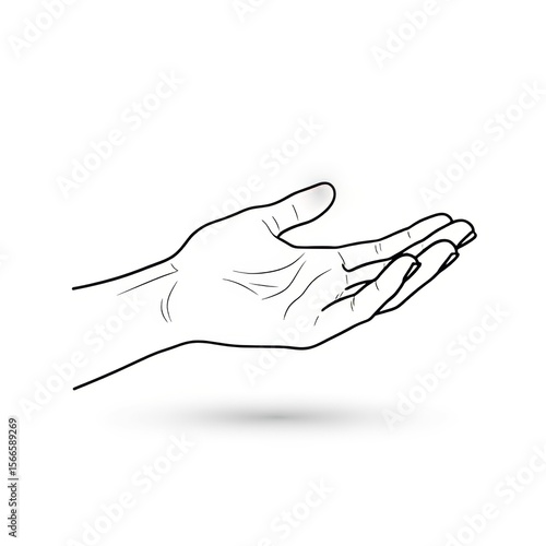 Outline drawing of a hand with palm open facing upwards in a receiving or offering gesture on white