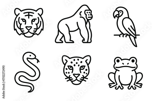 Outline drawings of tiger, gorilla, parrot, snake, leopard, and frog