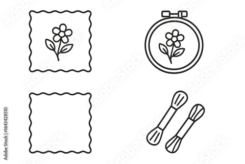 Outline Embroidery Handkerchief Icon Set. Floral Embroidered Linen Squares, Embroidery Hoop, Floss, Needlework Tools. Craft Textile, Sewing, DIY Art Supplies. Vector Graphic for Seamless Backgrounds.