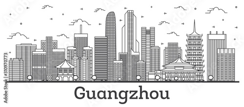 Outline Guangzhou China City Skyline with Modern Buildings Isolated on White.