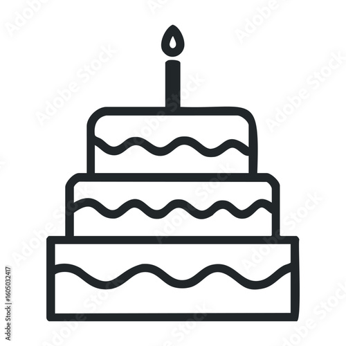 Outline icon of a three-tiered cake with single candle. Vector illustration