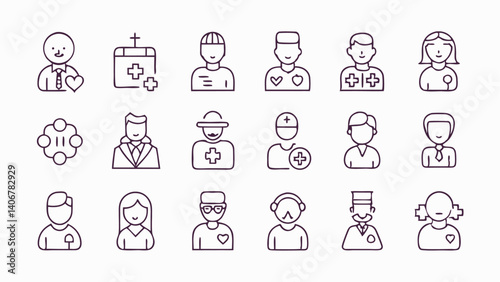 Outline icon pack representing doctors, healthcare tools, and professional services suitable for clinical websites, medical directories, and wellness apps