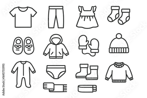Outline icons of children's clothing: dresses, socks, shoes, and more