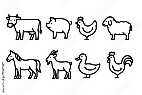 Outline icons of farm animals: cow, pig, chicken, sheep, horse, goat, duck, rooster