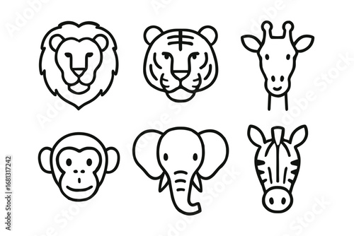 Outline icons of lion, tiger, giraffe, monkey, elephant, zebra in minimalist style