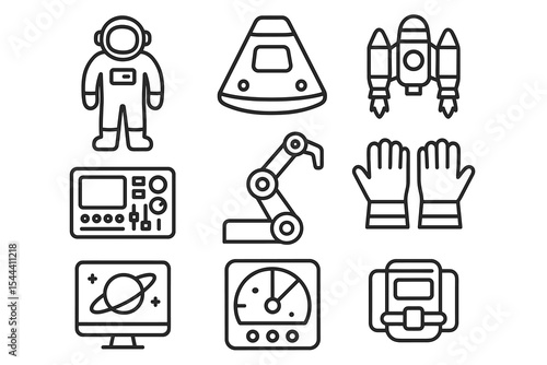 Outline icons of space suit, capsule, rocket, robotics, technology equipment