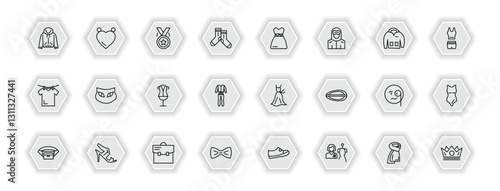 outline icons set - fashion concept. vector icons included sweater with hood, medal with a star, neckline dress, cat eyes and more.