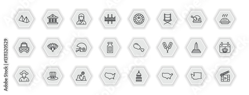outline icons set - united states of america concept. vector icons included pyramid, indian, casino, thanksgiving peacock and more.